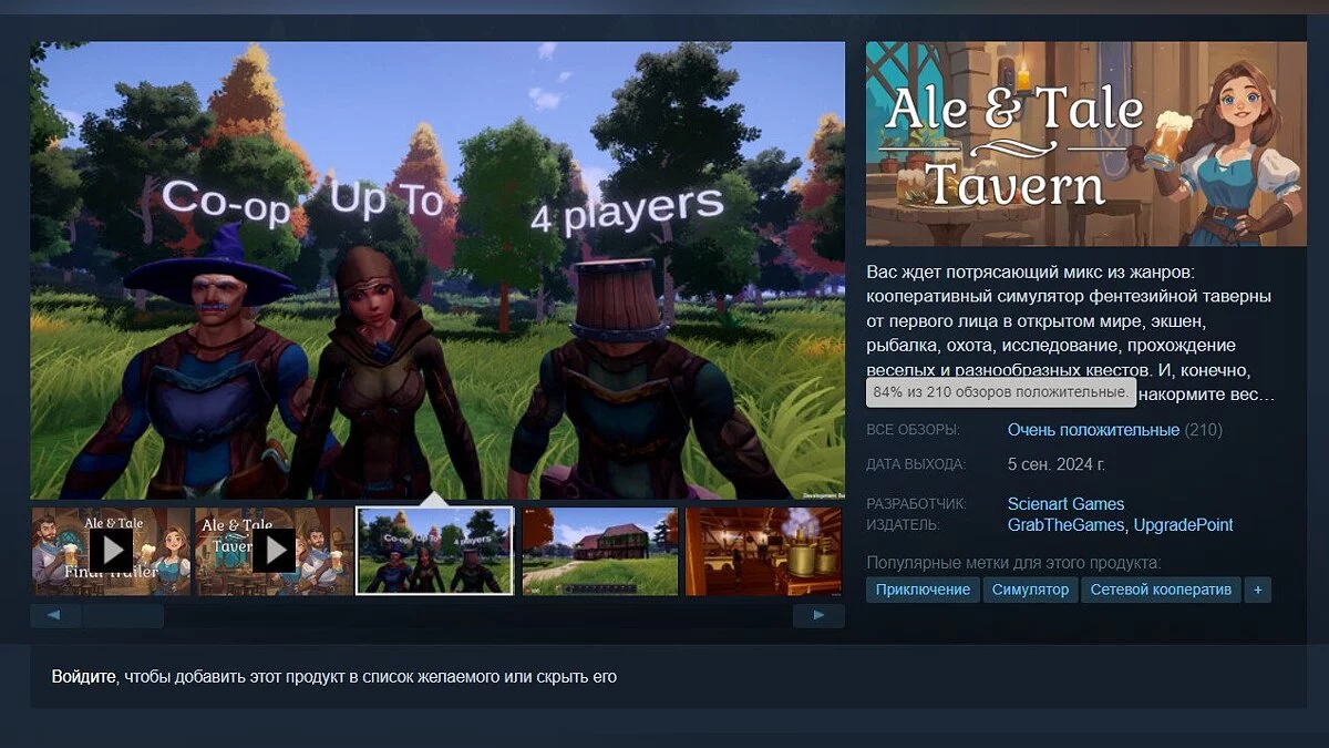 Ale & Tale Tavern продается в Steam за 495 руб с учетом скидки 10% (действует до 19 сентября). Есть бесплатный пролог.