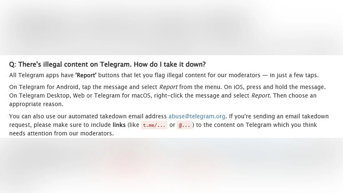 Новые правила опубликованы в разделе часто задаваемых вопросов. Ранее там сообщалось, что администрация не модерирует содержимое приватных чатов, однако сейчас утверждается обратное. В чатах появилась кнопка «Пожаловаться», позволяющая отправить сообщение на проверку. Жалобу также можно оправить на почту abuse@telegram.org.