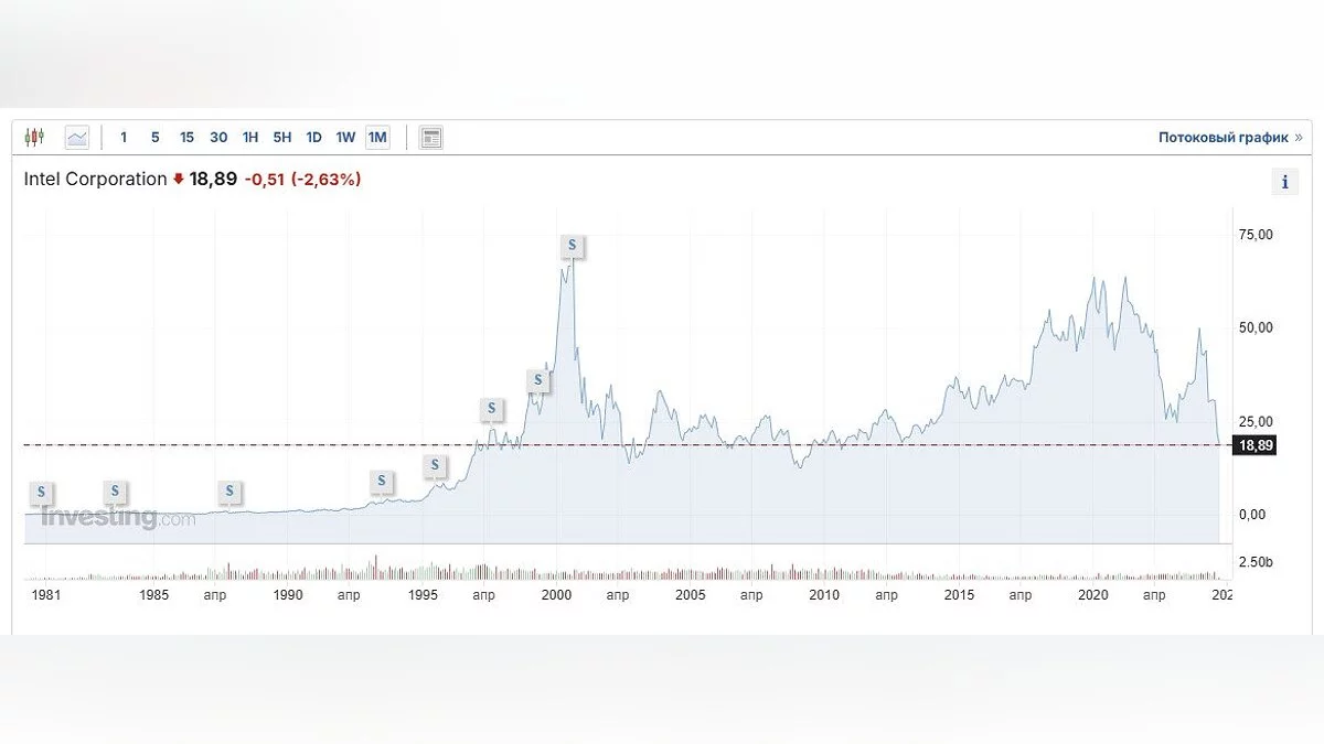 Лучшая шутка про обвал акций звучит так: «Если бы вы инвестировали $10 000 в Intel 27 лет назад, сейчас у вас было бы $10 000». Пост в соцсети X набрал 33 тысячи лайков.