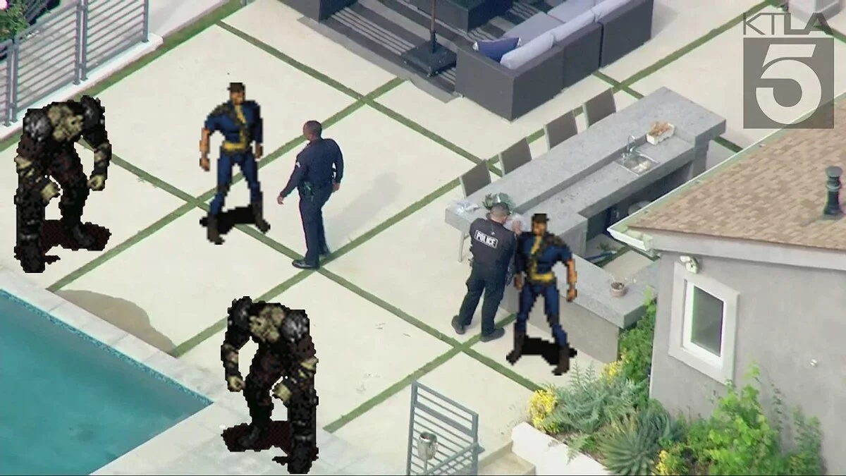 Новостной телеканал Лос-Анжелеса опубликовал снимок полицейских на месте преступления, который тут же разошелся на мемы. Фото так сильно напоминает скриншот из изометрической игры, что геймеры принялись повально сравнивать его с Fallout, Project Zomboid и Sims.