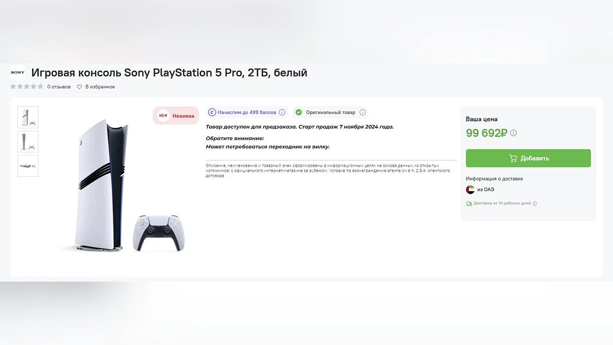 Одним из первых предзаказы открыл сервис CDEK.Shopping. Там доставка консоли из ОАЭ обойдется в 99 692 рубля с учетом всех дополнительных расходов. Для сравнения, PS5 Slim (цена в США — $500 или 45 000 рублей) продается от 46 983 рублей. Возможно, позже на сайте появятся другие, более выгодные предложения.