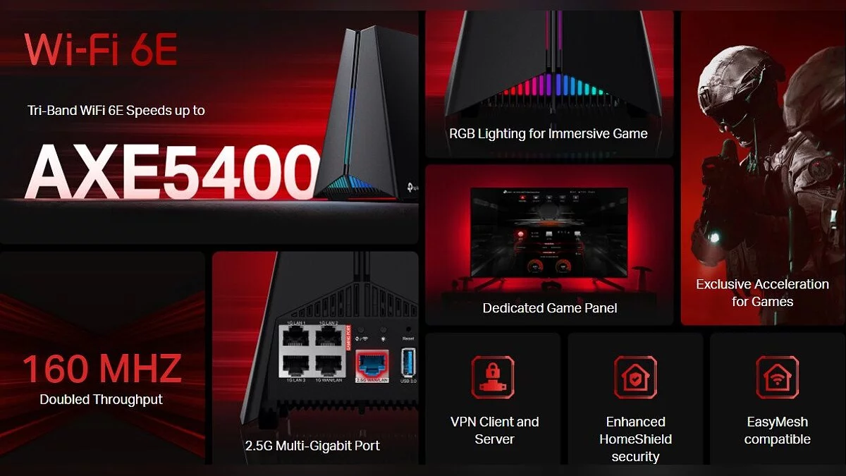 TP-Link представила новый маршрутизатор Archer GXE75, разработанный специально для геймеров. Он поддерживает новейший стандарт Wi-Fi 6E и работает в трёх диапазонах: 6 ГГц, 5 ГГц и 2,4 ГГц. Устройство отличается необычным дизайном в форме призмы, что подчёркивает его футуристический облик.
