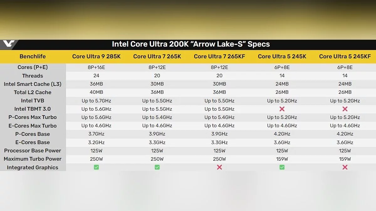 Core Ultra 5 245K и 245KF предложат более скромную конфигурацию с 6 P-ядрами и 8 E-ядрами, с кешем L3 объёмом 24 МБ и L2 — 20 МБ. Эти процессоры смогут автоматически разгоняться до 5,2 ГГц, а их энергопотребление будет ограничено 159 Вт.