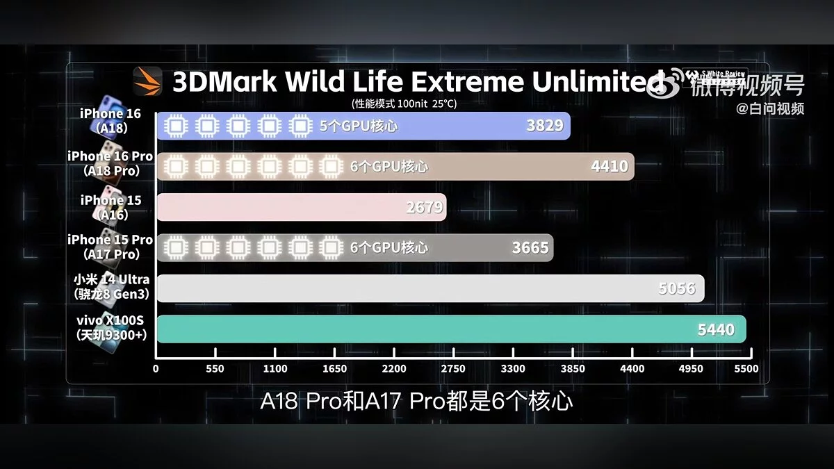 В тесте Wildlife Extreme Unlimited от 3DMark A18 Pro набрал 4410 баллов, а обычный A18 (установлен в iPhone 16 и iPhone 16 Plus) — 3829 баллов. Для сравнения A17 Pro получил 3665 баллов. Snapdragon 8 Gen 3, в свою очередь, смог набрать 5056 баллов, а Dimensity 9300+ — 5440 баллов.