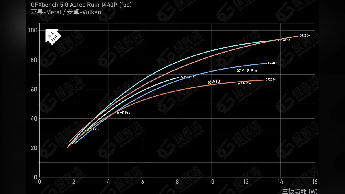 В тесте Aztec Ruin 1440p от GFXBench частота кадров A18 Pro составила 73 FPS, а у Snapdragon 8 Gen 3 — 94 FPS. Но чип Apple потребляет при этом меньше энергии — 11,5 Вт против 13,7 Вт.