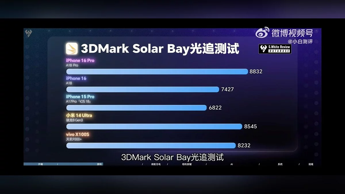 В тесте трассировки лучей Solar Bay от 3DMark A18 Pro все-таки смог обогнать конкурентов, набрав 8832 балла (A18 — 7427 баллов, A17 Pro — 6822 балла, Snapdragon 8 Gen 3 — 8545 баллов, а Dimensity 9300+ — 8232 балла).