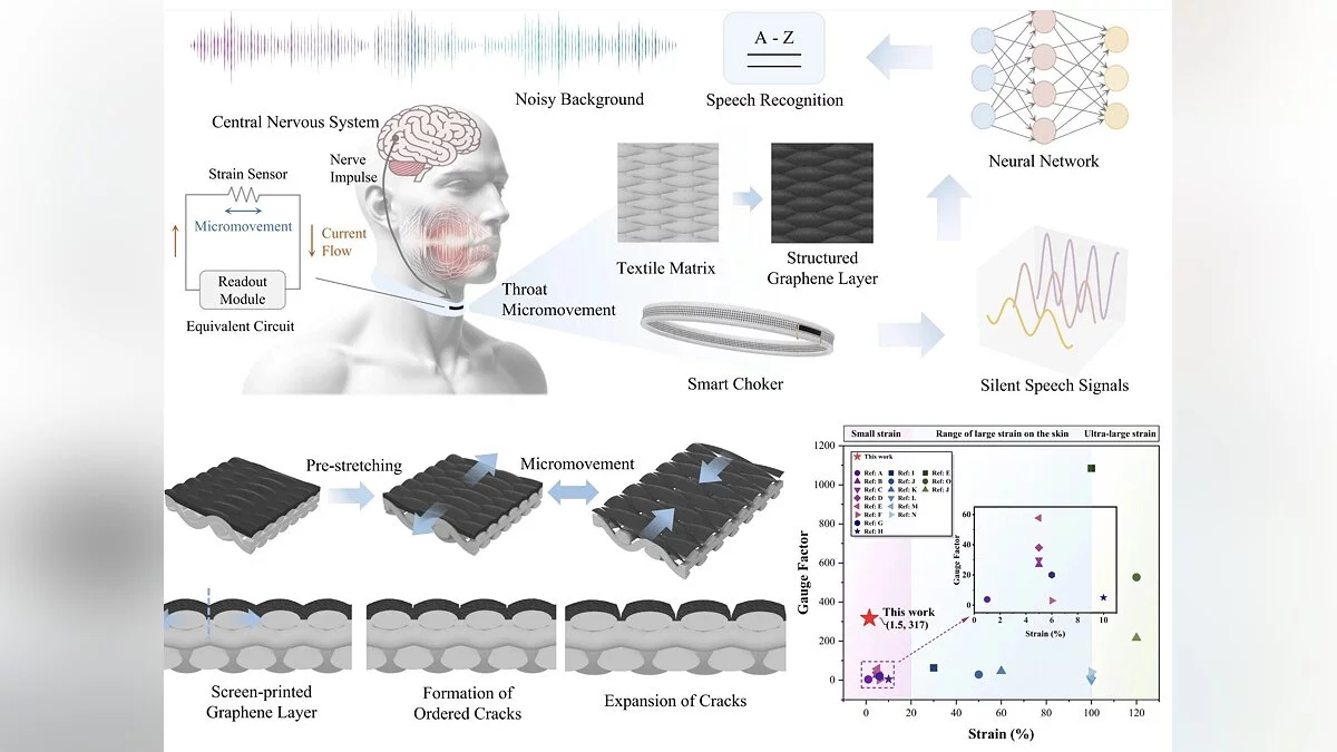Основой технологии являются деформационные датчики, включающие медные электроды и слой графеновых чернил. Эти элементы считывают вибрации в горле пользователя, которые возникают при попытке говорить. Далее искусственный интеллект анализирует колебания электрического тока и определяет, какие слова произносит человек, озвучивая их с помощью встроенного синтезатора речи.