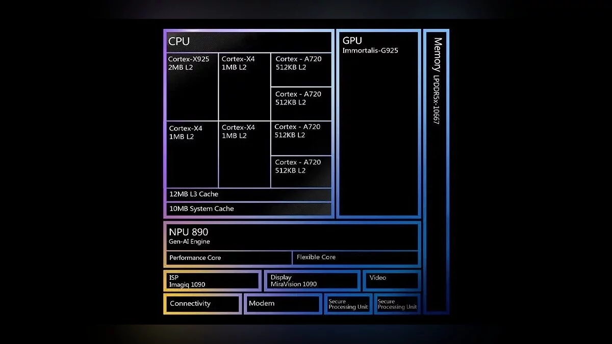 Одним из значительных обновлений является новый графический процессор Immortalis-G925, который демонстрирует на 41% более высокую пиковую производительность и улучшает трассировку лучей на 40%, сохраняя при этом на 44% энергии больше чем предыдущий флагман компании. Этот чип также поддерживает работу с LPDDR5X памятью, что увеличивает пропускную способность до 10,7 Гб/с.