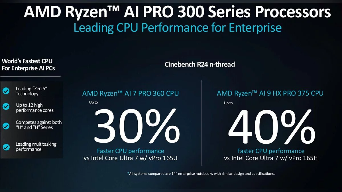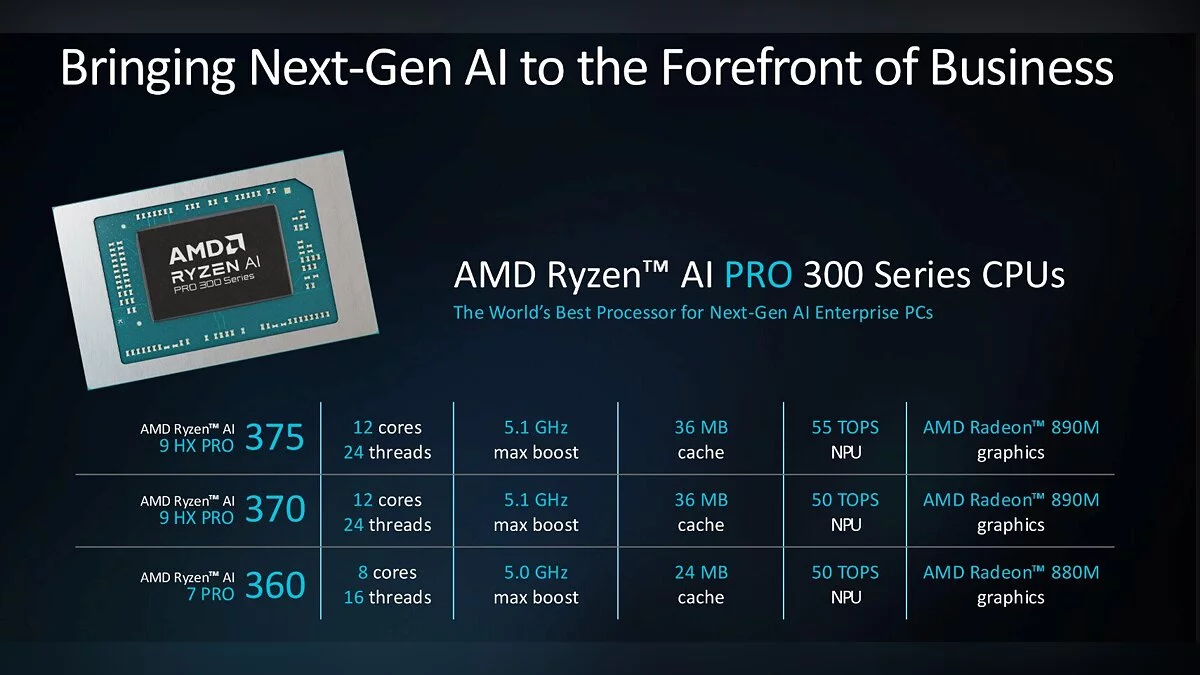 Мобильные процессоры Ryzen AI Pro 300 разработаны для корпоративных ноутбуков. Они используют 4-нм техпроцесс и архитектуры Zen 5 и Zen 5c, предлагая до 12 ядер и встроенную графику RDNA 3.5. Отличительной чертой этих чипов стала интеграция ИИ-движка XDNA второго поколения с производительностью до 55 TOPS, что значительно превосходит показатели предшественников. AMD утверждает, что производительность новых процессоров выше, чем у Intel Core Ultra 7 165U vPro, на 9% в офисных приложениях.