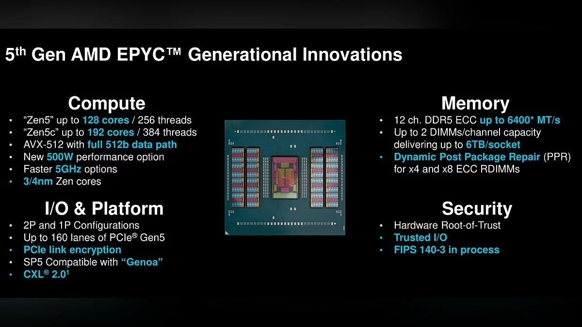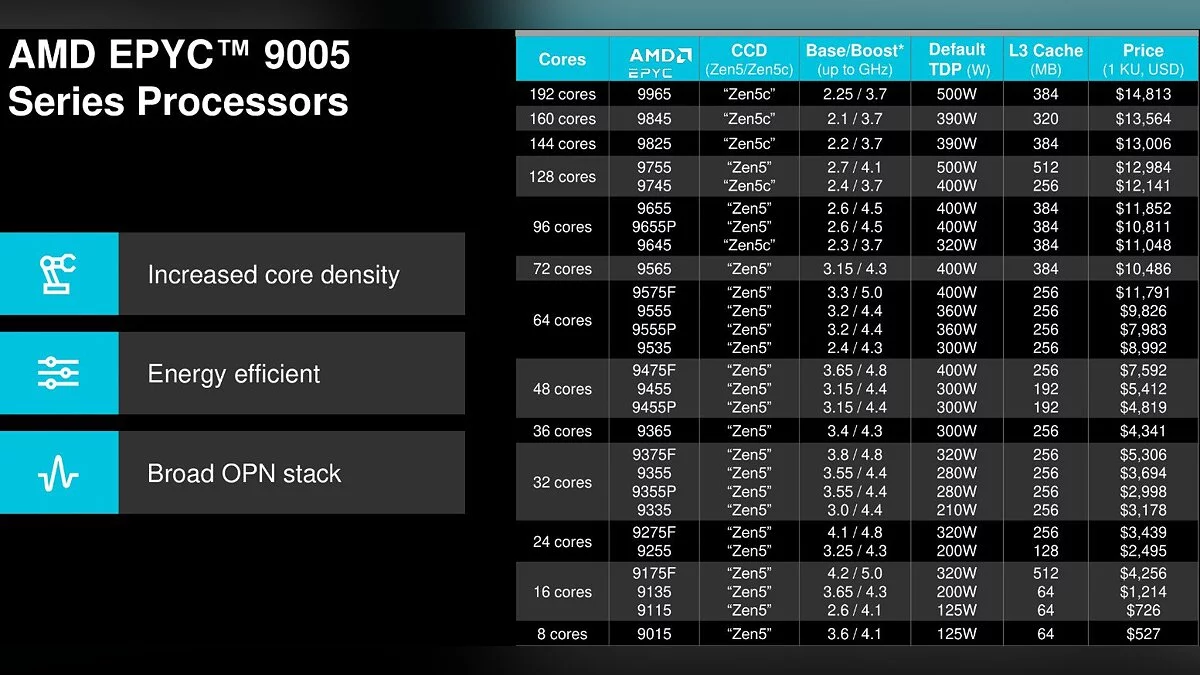 Для серверов компания представила новые процессоры EPYC 9005, выполненные на архитектуре Zen 5 и Zen 5c. Модели Turin Classic включают до 128 ядер, тогда как Turin Dense — до 192 ядер, ориентированных на энергоэффективность. Процессоры поддерживают память DDR5-6400 и демонстрируют рост производительности в задачах HPC и ИИ на 37% по сравнению с предыдущими поколениями.