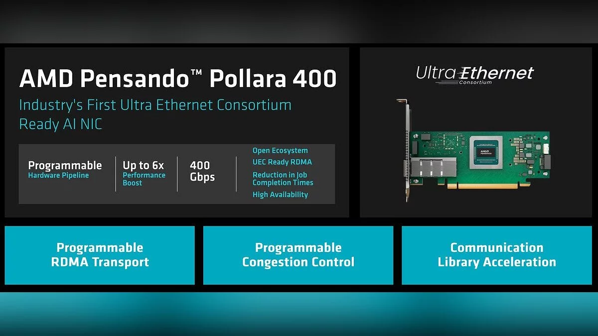 Сетевая карта Pensando Pollara 400, способная передавать данные на скорости до 400 Гбит/с, обеспечит оптимизацию сетевого взаимодействия в центрах обработки данных, задействованных в ИИ-вычислениях. Ожидается, что она поступит в продажу в 2025 году, после публикации спецификации UEC 1.0.
