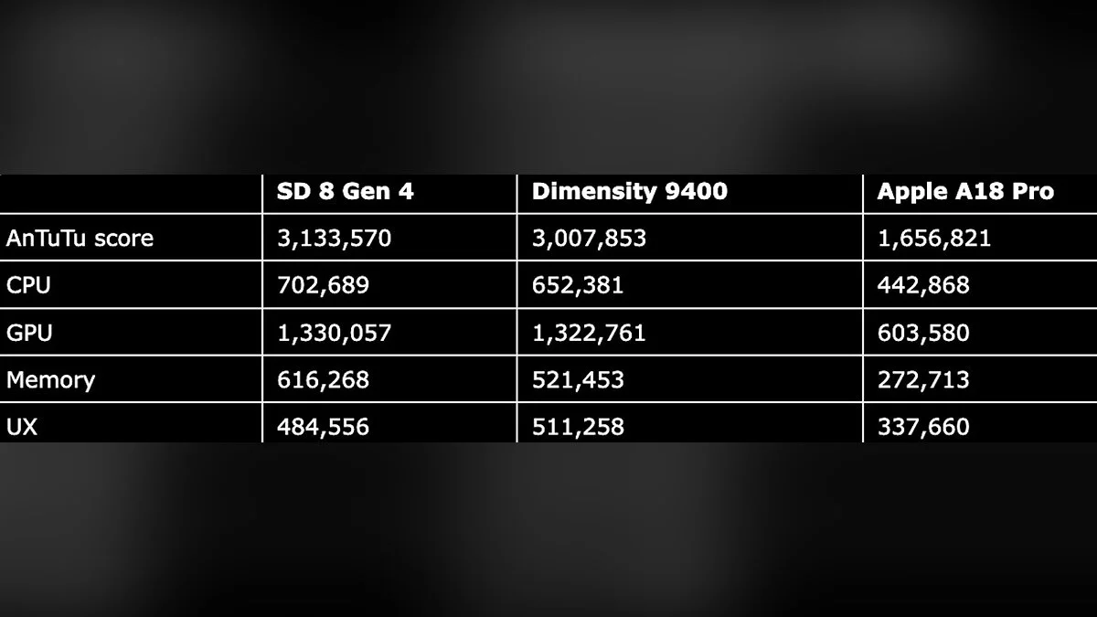 В бенчмарке AnTuTu процессор набрал 3133570 баллов. Для сравнения, Snapdragon 8 Gen 3 получил 2128819 баллов. Он смог обойти Dimensity 9400 (3007853 балла) и Apple A18 Pro (1656821 балл).
