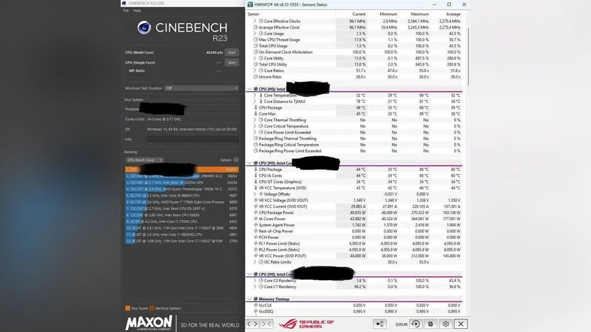 В ходе тестирования максимальный уровень TDP новинки составил 370 Вт, что существенно выше, чем у многих конкурентов. При этом пиковая тактовая частота P-ядер достигла 5,6 ГГц, а E-ядер — 3,9 ГГц. Это позволяет процессору набирать внушительные 46 289 баллов в Cinebench R23, что на 8,5% больше, чем у модели Core i9-14900K, хотя у последней и меньшее количество потоков.