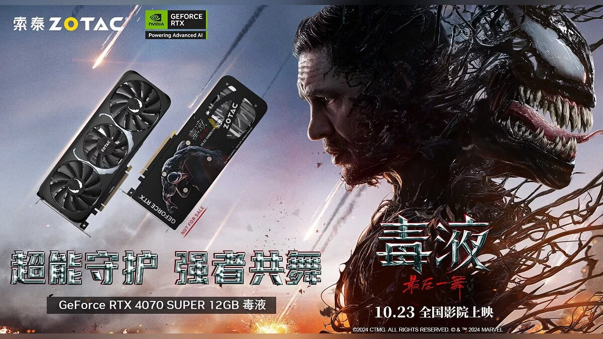 Sony и Zotac приготовили неожиданный сюрприз к премьере фильма «Веном: Последний танец» — игровую видеокарту GeForce RTX 4070 Super с изображением симбиота. Инопланетное существо украшает переднюю и заднюю части ускорителя.