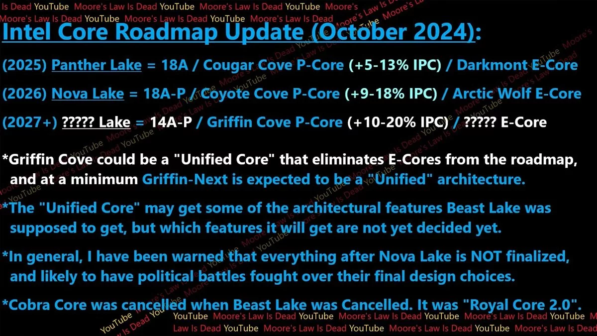 Новые процессоры Intel с унифицированной архитектурой могут предложить P-ядра Griffin Cove, которые, по словам инсайдера, обеспечат прирост производительности на 10-20% по сравнению с предыдущими версиями. Производство этих процессоров будет происходить на базе улучшенного техпроцесса Intel 14A-P.