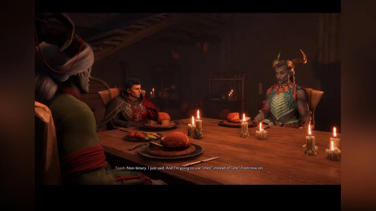 Пользователи сети обратили внимание на спорные моменты, касающиеся репрезентации главного героя и его компаньонов. Так, игрок может сделать протагониста трансгендером, а кунари Тааш в одной сцене называет себя небинарной личностью. Напомним, что похожую историю рассказывал предполагаемый тестировщик игры.