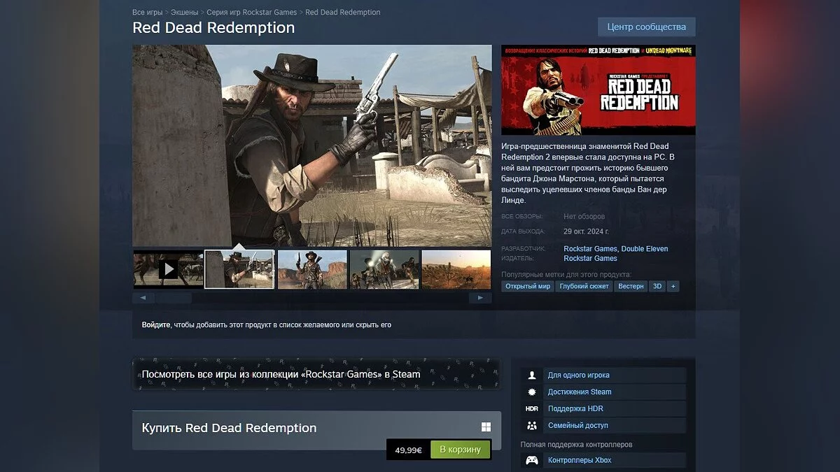 Оригинальный релиз Red Dead Redemption состоялся ещё в 2010 году для PS3 и Xbox 360. Средняя оценка на Metacritic составляет 95 баллов.