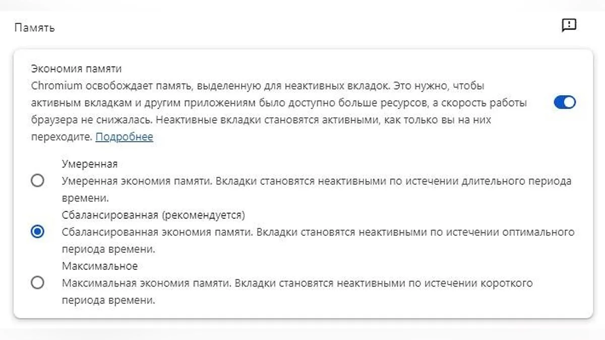 В рамках нового обновления запускаются три режима экономии памяти: Стандартный, Сбалансированный и Расширенный. Эти режимы позволяют пользователям настроить, насколько агрессивно браузер будет освобождать ресурсы от неактивных вкладок. Например, Стандартный режим автоматически деактивирует вкладки в зависимости от потребностей системы, в то время как Расширенный режим ставит потребности системы выше потребностей браузера и част оперативной памяти всегда держит в запасе под нужды системы.