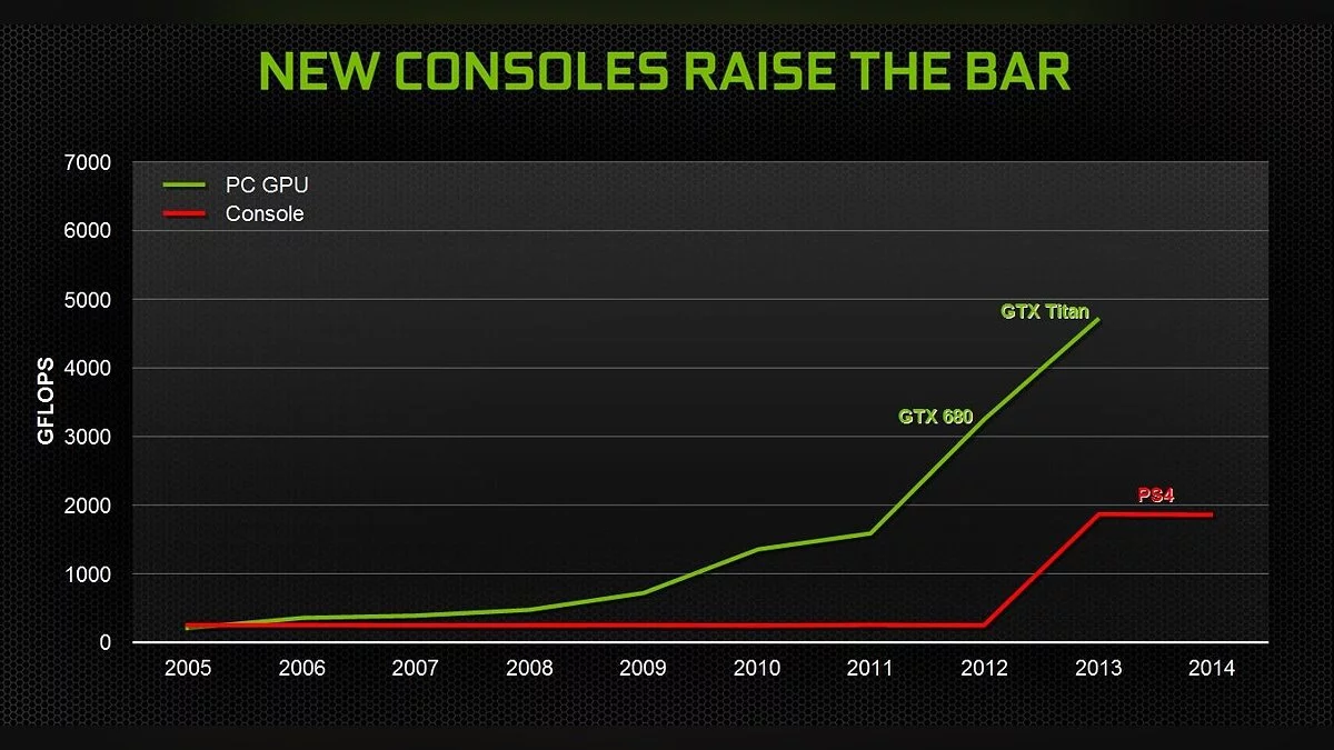 На следующем слайде Nvidia показала превосходство своих GPU над графической составляющей PS4. Как мы знаем, производительность новой консоли Sony составляет 1,84 терафлопс. Конечно, разработчики всегда могут выжать больше, ведь речь идёт, в конце концов, о приставке, однако, судя по изображению, Nvidia удалось достичь результата в 2 терафлопс ещё два года назад. Её GeForce GTX TITAN в 2,5 раза мощнее, чем интегрированный видеочип PS4. Похоже, «зелёный лагерь» готов достойно встретить новое поколение игровых систем.