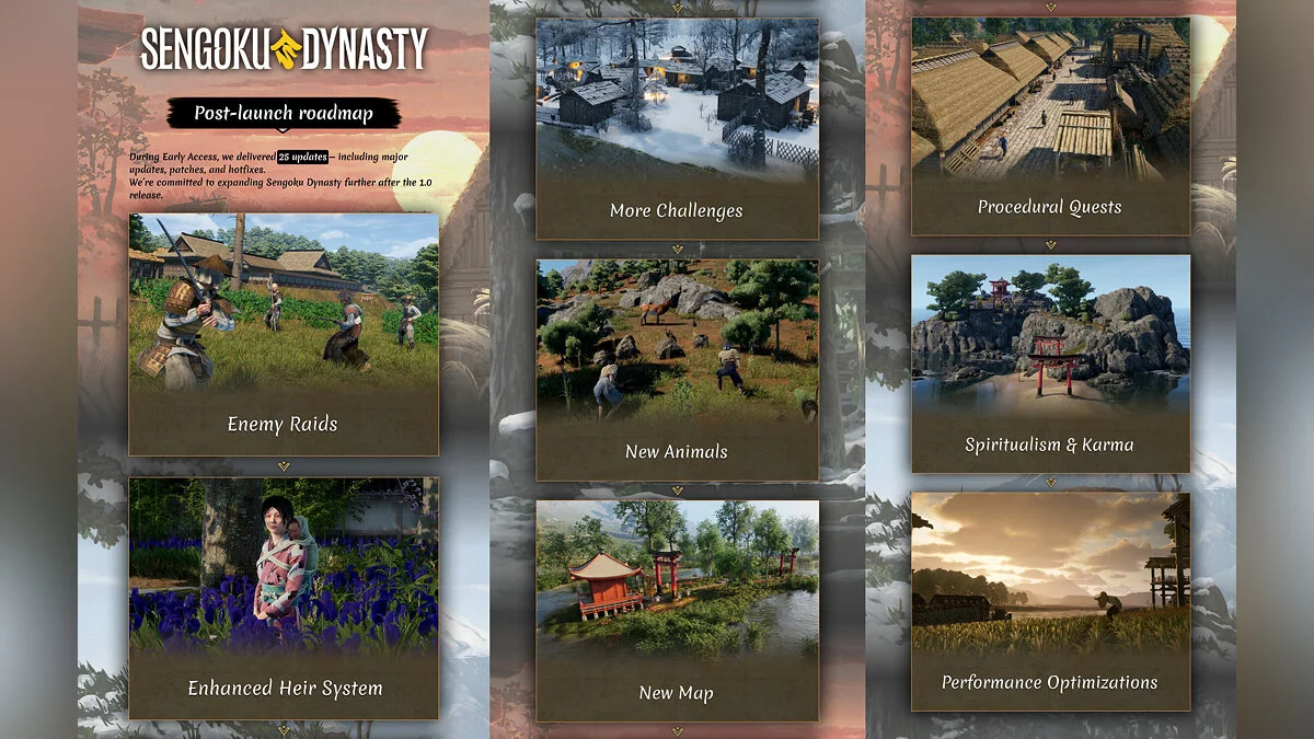 Одновременно с выходом из раннего доступа Sengoku Dynasty получила крупное обновление 1.0, которое добавило в игру вражеские рейды, сезонные испытания, новых животных и процедурные квесты, доработало систему наследников, улучшило оптимизацию и не только.