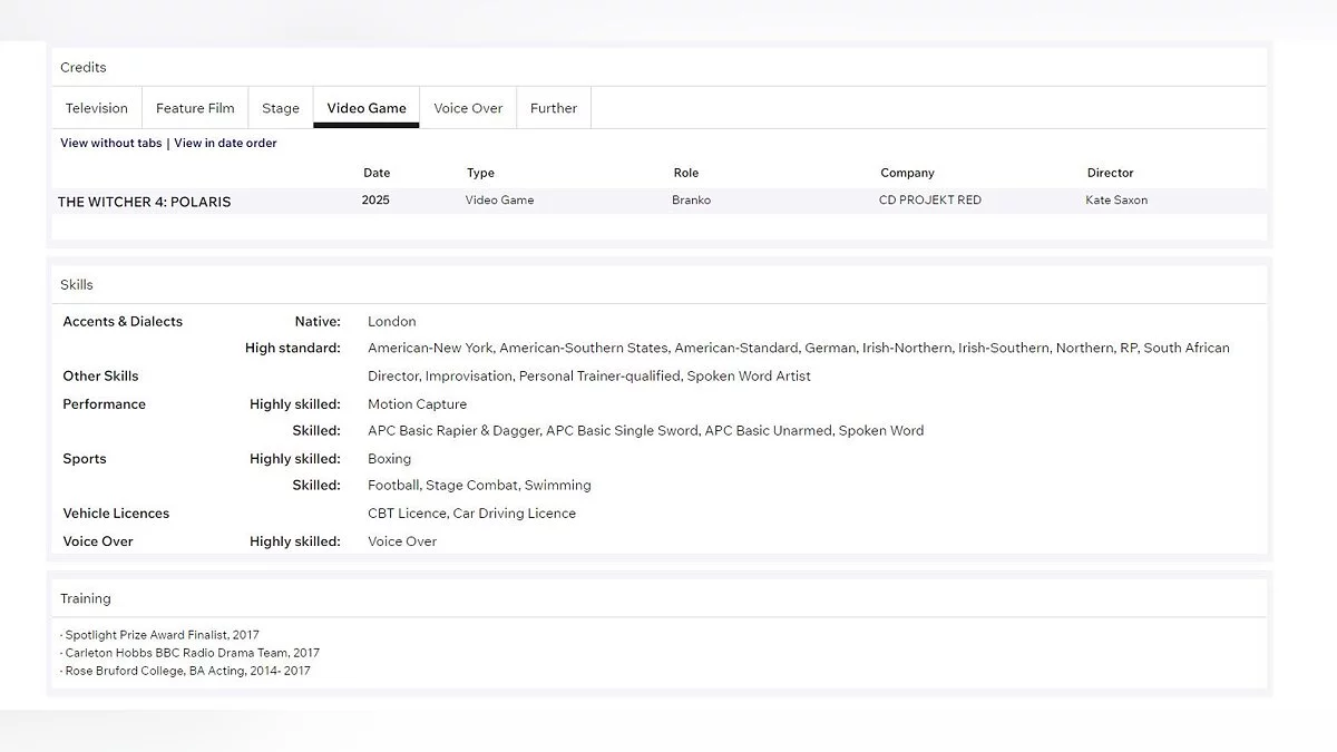 Информацию обнаружили в профиле британского актера Джейка Ламперта (Jake Lampert), известного по сериалу «Андор». Это первое его участие в видеоиграх — конкретно в The Witcher 4 он исполнит роль некоего Бранко. Кем будет этот персонаж, пока неясно. Однако примечательно, что CD Projekt RED приняла в команду человека, в чьих компетенциях указано владение рапирой, кинжалом и одноручным мечом, а также захват движений и озвучка. Так что не исключено, что Бранко — это кто-то из ведьмаков. Авторитетный портал Redanian Intelligence предположил, что герой будет родом из Северных Королевств, поскольку носит славянское имя.