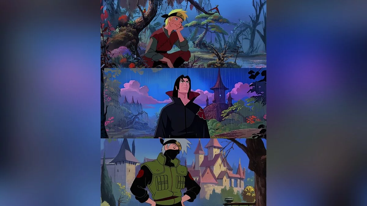 За основу промпта художник взял классические мультфильмы студии, где были статичные отрисованные фоны. На артах ниже можно увидеть, как преобразились Наруто, Итачи, Какаси, Джирайя, Хаширама, Саске, Цунаде, Сакура, Шикамару, Хината, Минато и Гаара.
