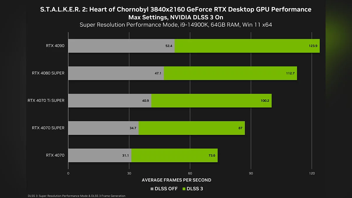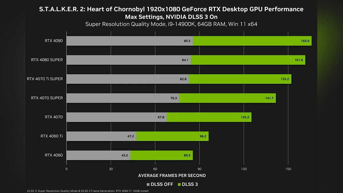 NVIDIA поделилась результатами тестов S.T.A.L.K.E.R. 2: Heart of Chornobyl, которая выйдет 20 ноября. Игру проверяли на видеокартах RTX 40-й серии, где есть поддержка технологии DLSS 3 с генерацией кадров.