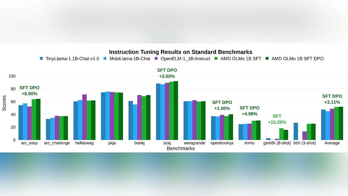 Тесты показали, что модели OLMo превосходят аналоги в оценках производительности и многозадачности. AMD сообщает, что OLMo превзошла такие открытые модели, как TinyLlama и MobiLlama, показав значительное улучшение в бенчмарках, включая прирост точности на 5,09% в MMLU и на 15,32% в GSM8k. В тестах на выполнение инструкций модели OLMo обошли конкурентов в AlpacaEval 2 Win Rate на 3,41%, а в диалоговых сценариях MT-Bench улучшили показатели на 0,97%.