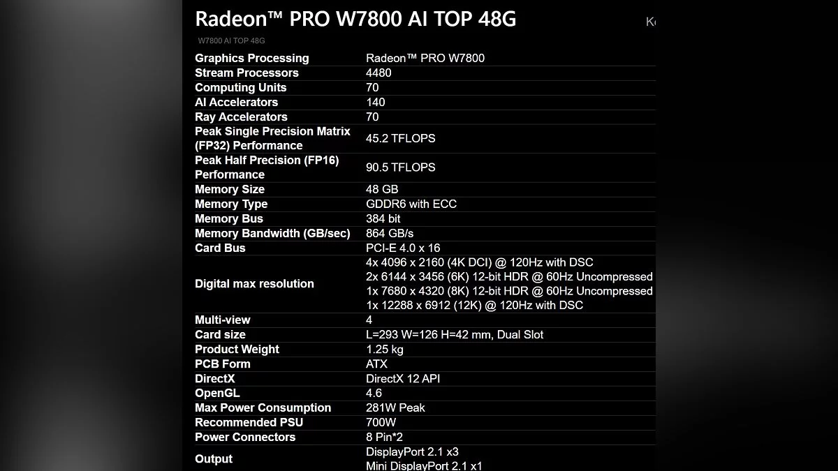 Основанная на графическом процессоре Navi 31 с архитектурой RDNA 3 и 4480 потоковыми процессорами, видеокарта предлагает впечатляющую вычислительную производительность. На операциях половинной точности FP16 достигается 90,5 терафлопс, а на FP32 — 45,2 терафлопс., а предельное энергопотребление модели составляет 281 Вт.