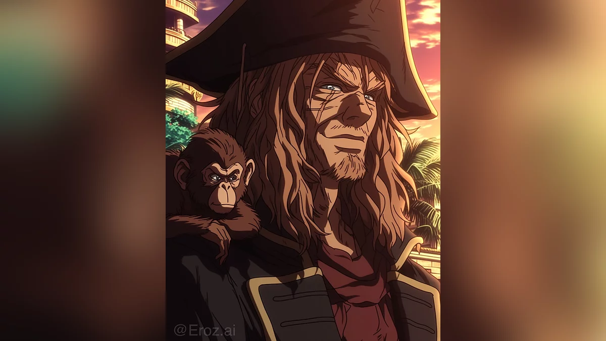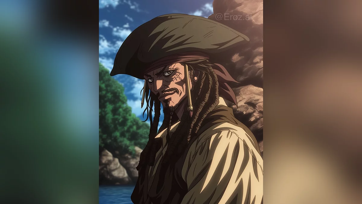 Пользователь с ником eroz.ai снова воспользовался нейросетью Midjourney, чтобы перенести популярных персонажей в мир японского аниме. На этот раз он показал в этом стиле героев «Пиратов Карибского моря».