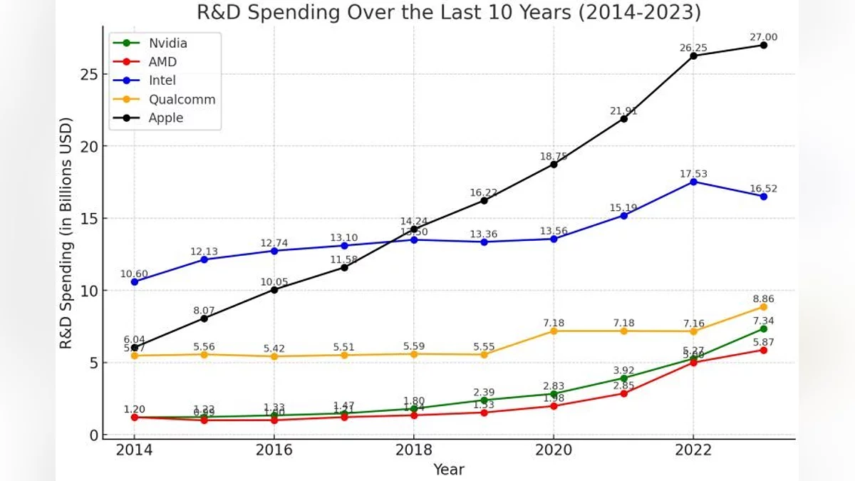 Однако абсолютным лидером по расходам на исследования остаётся Apple, выделившая $31 млрд за последний год, что почти вдвое превышает траты NVIDIA и Intel.