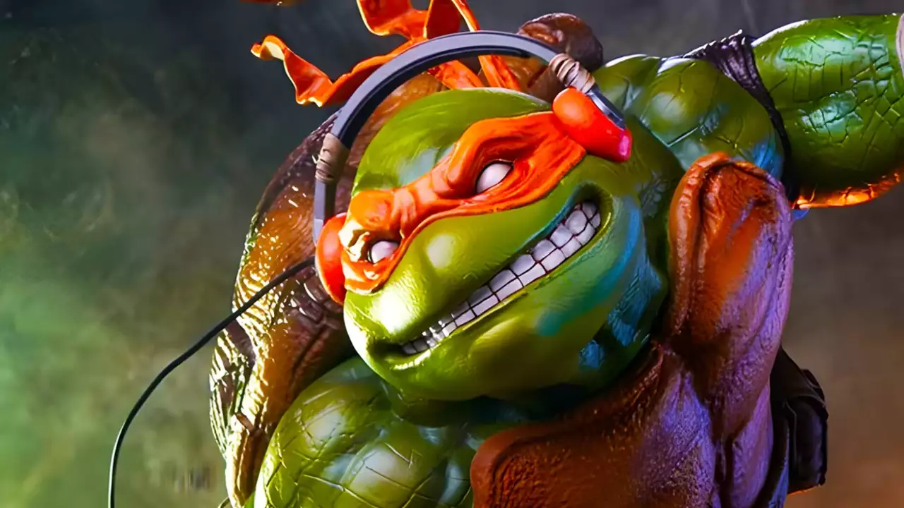 Показана крутая коллекционная фигурка Микеланджело — Черепашка-ниндзя на скейте и с пиццей в руках -