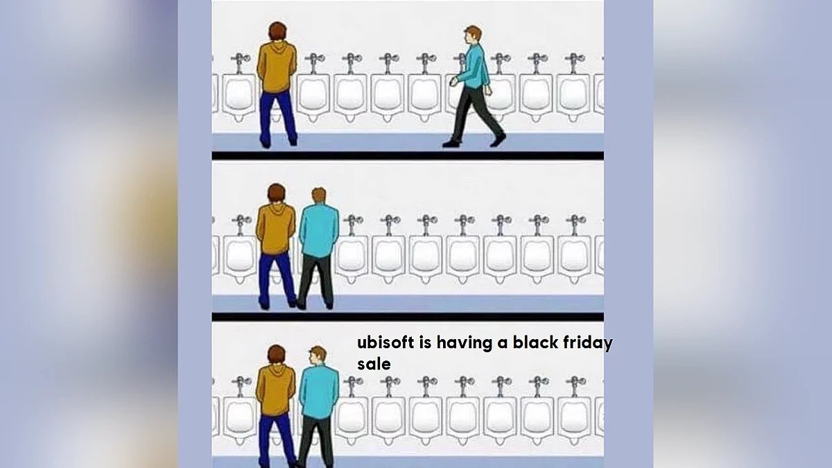 Ubisoft опубликовала мем с назойливым мужчиной в общественном туалете, что вызвало насмешки со стороны игроков. Мем был опубликован на страничке Ubisoft в X и быстро распространился среди пользователей. В меме мужчина настойчиво предлагает игрокам купить игру в «Чёрную пятницу». Многие пользователи были возмущены таким поведением Ubisoft и назвали мем оскорбительным и неуместным.