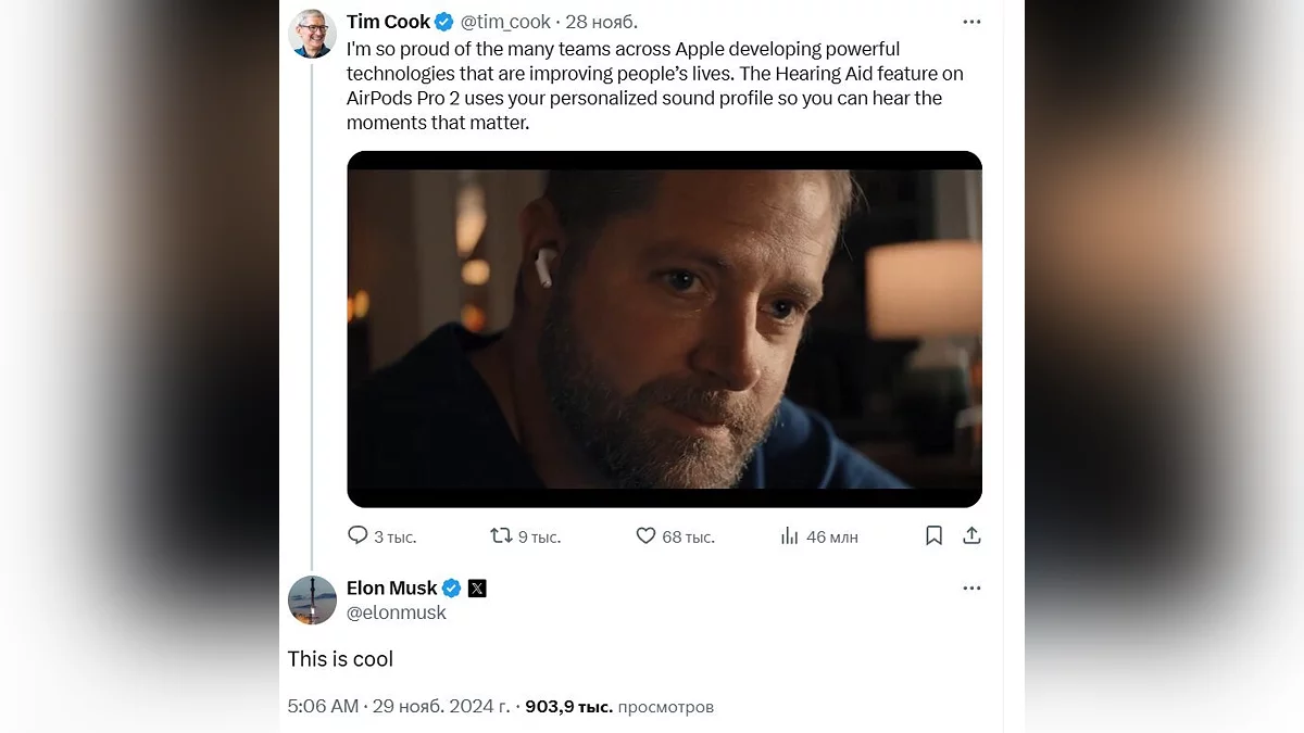 «Это круто», — так прокомментировал функцию знаменитый миллиардер. Об этом он написал в комментариях под постом генерального директора Apple Тима Кука (Tim Cook), который, в свою очередь, заявил, что гордится командой разработчиков, участвовавших в реализации функции слухового аппарата для AirPods Pro 2.