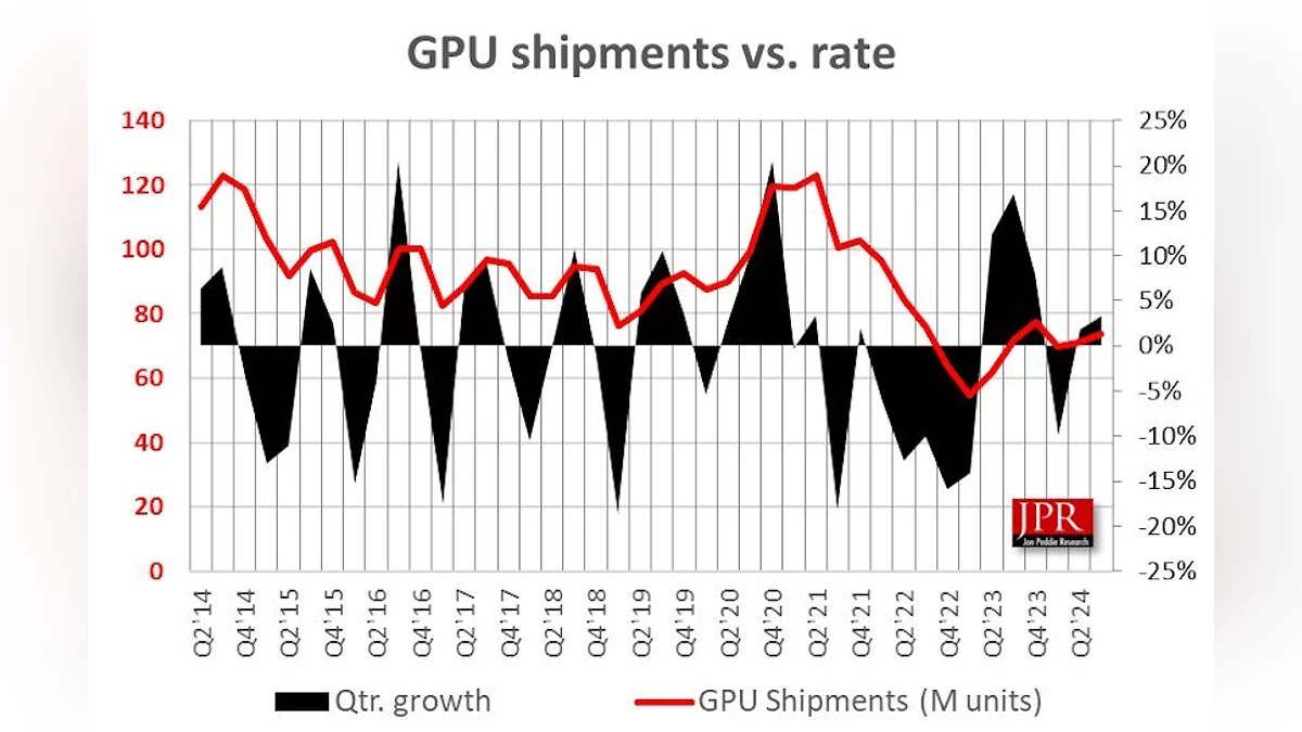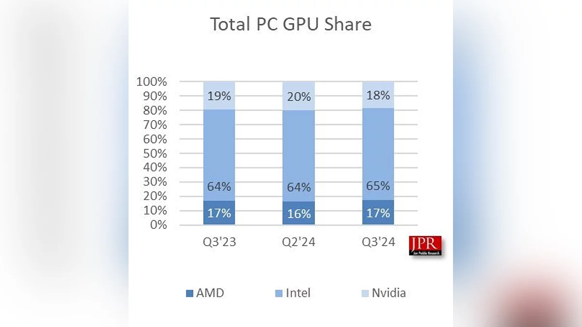 Аналитическое агентство Jon Peddie Research представило отчёт о мировых поставках графических процессоров за третий квартал 2024 года. Главным открытием стало лидерство Intel в сегменте, что, однако, связано с учётом интегрированных GPU (iGPU),во встроенных в процессоры.