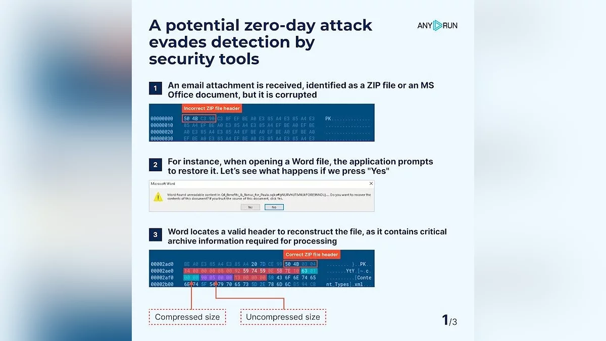 Как заявляют специалисты по кибербезопасности, злоумышленники намеренно повреждают Word-файлы и ZIP-архивы, так что их нельзя проверить обычными средствами. Система не помечает их как подозрительные и вредоносные, поэтому они спокойно попадают в почту. Для запуска такие файлы используют встроенные механизмы восстановления Word, Outlook и WinRAR.