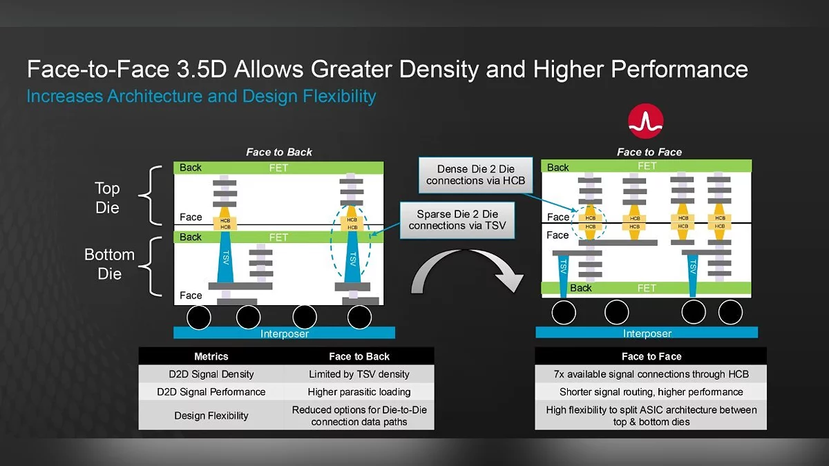 Ключевой особенностью технологии является вертикальная укладка чипов лицом к лицу (F2F), что снижает энергопотребление, минимизирует задержки и увеличивает плотность соединений в чипах. В результате этой технологии плотность соединений в разы выше по сравнению с традиционными методами, что делает устройства более энергоэффективными и производительными.