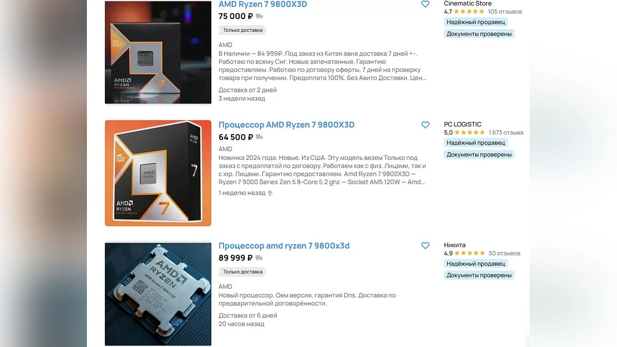 Однако покупатели столкнулись с неприятной ситуацией — ценник на новинку значительно отличается от официальной стоимости. Официальная цена Ryzen 7 9800X3D на момент релиза составляет $479 (около 48 000 рублей), но в российских магазинах стоимость процессора начинается с 65 000 рублей, а в некоторых крупных ритейлерах цена достигает 84 999 рублей.