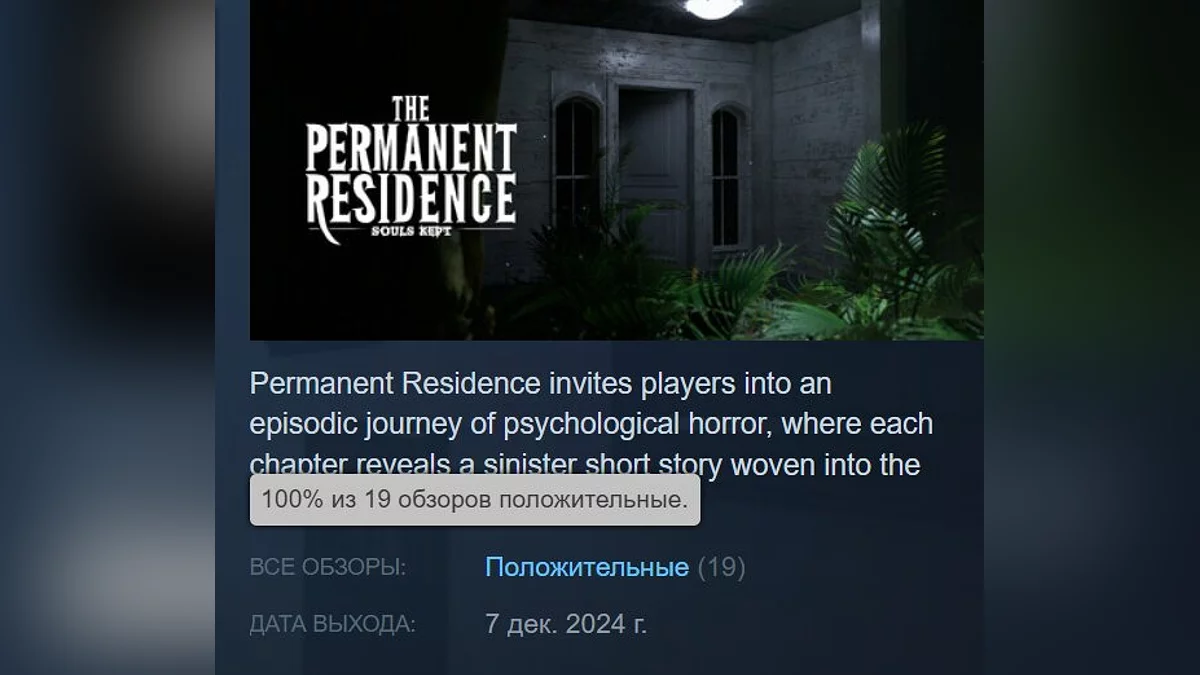 The Permanent Residence: Souls Kept — короткий хоррор про музыканта, который должен раскрыть зловещую историю мрачного особняка. Проект получил 100% рейтинга. Страница в Steam.