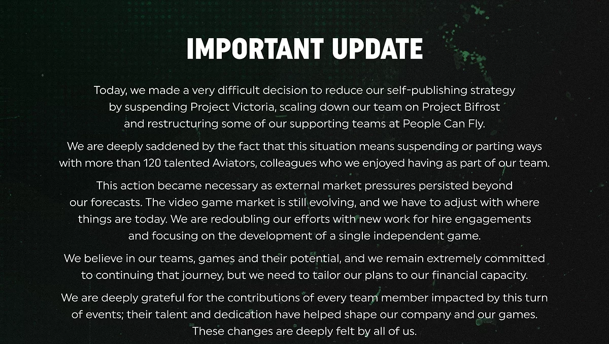Генеральный директор People Can Fly Себастьян Войцеховски сообщил в своём блоге, что увольнения стали результатом изменений в стратегии компании, включая приостановку разработки Victoria, сокращение команды Bifrost и реструктуризацию вспомогательных отделов.
