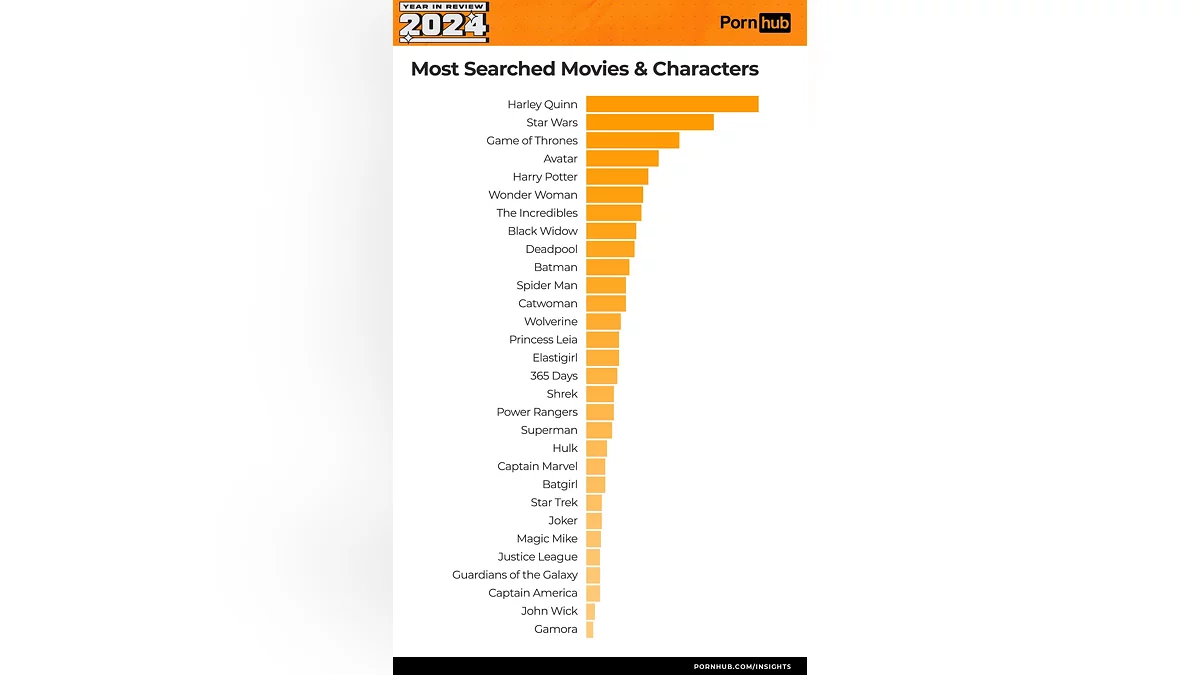 Ниже представлены главные запросы, связанные с кино. Чаще всего посетители Pornhub искали искали Харли Квинн и видео по «Звездным войнам», «Игре престолов» и «Аватару».