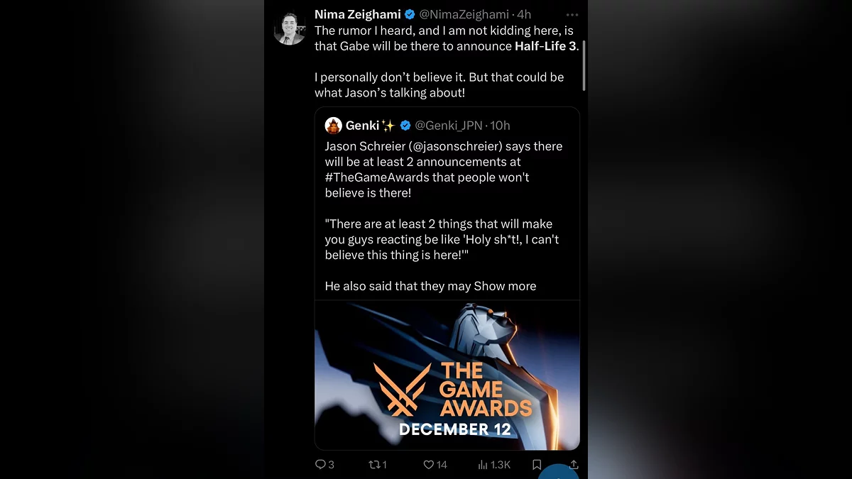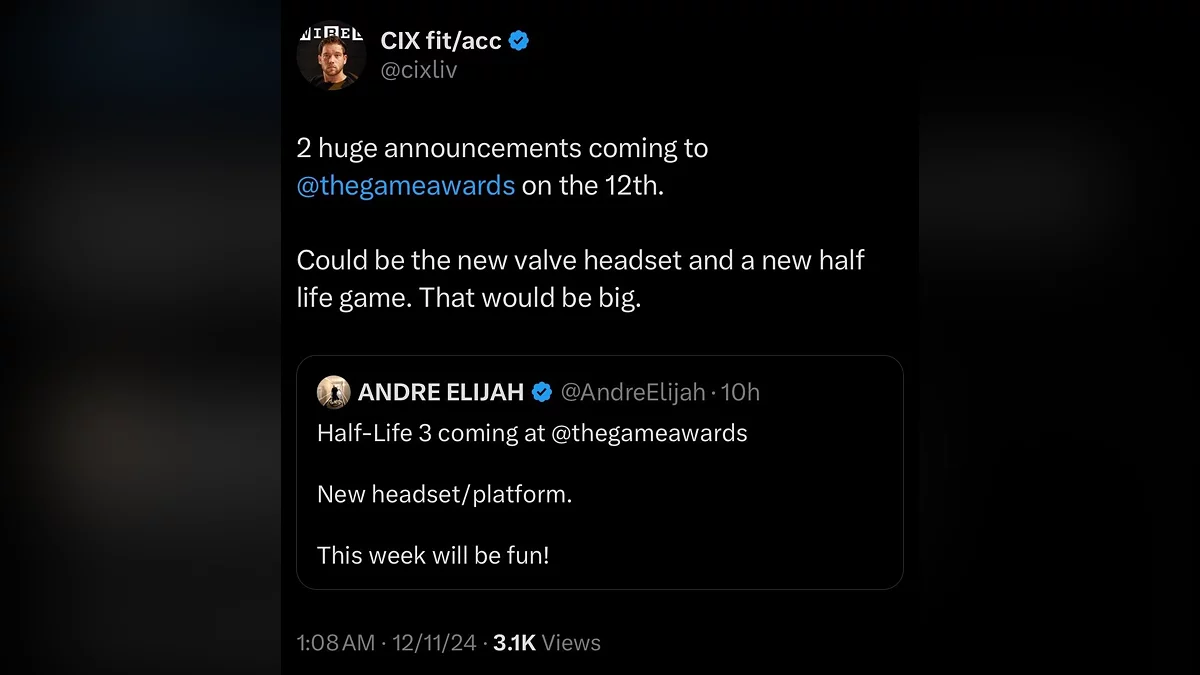 Недавно авторитетный журналист Джейсон Шрайер (Jason Schreier) сообщил, что на The Game Awards 2024 будет два очень громких анонса. По его словам, они будут настолько большими, что игроки потеряют дар речи. По слухам, одним из этих проектов является Half-Life 3.