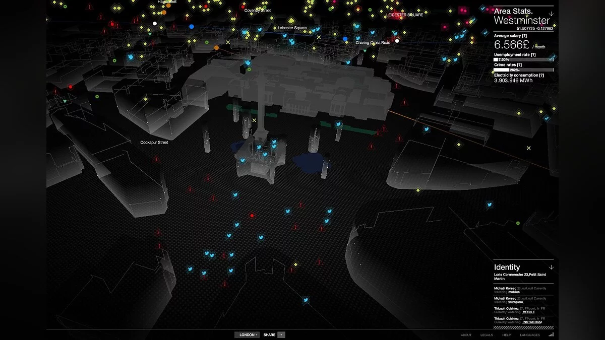 Пользователям предоставляется доступ к реальным данным о различных инфраструктурах, а также жителях Лондона, Берлина и Парижа. Все это осуществляется благодаря трехмерному картографированию и сайт может быть не только интересен, но и полезен. Например, здесь вы сможете изучить расписание транспорта, получить информацию о среднем доходе или уровне преступности. Также на карте отображаются телекоммуникационные сети, камеры наблюдения, светофоры и многое другое.