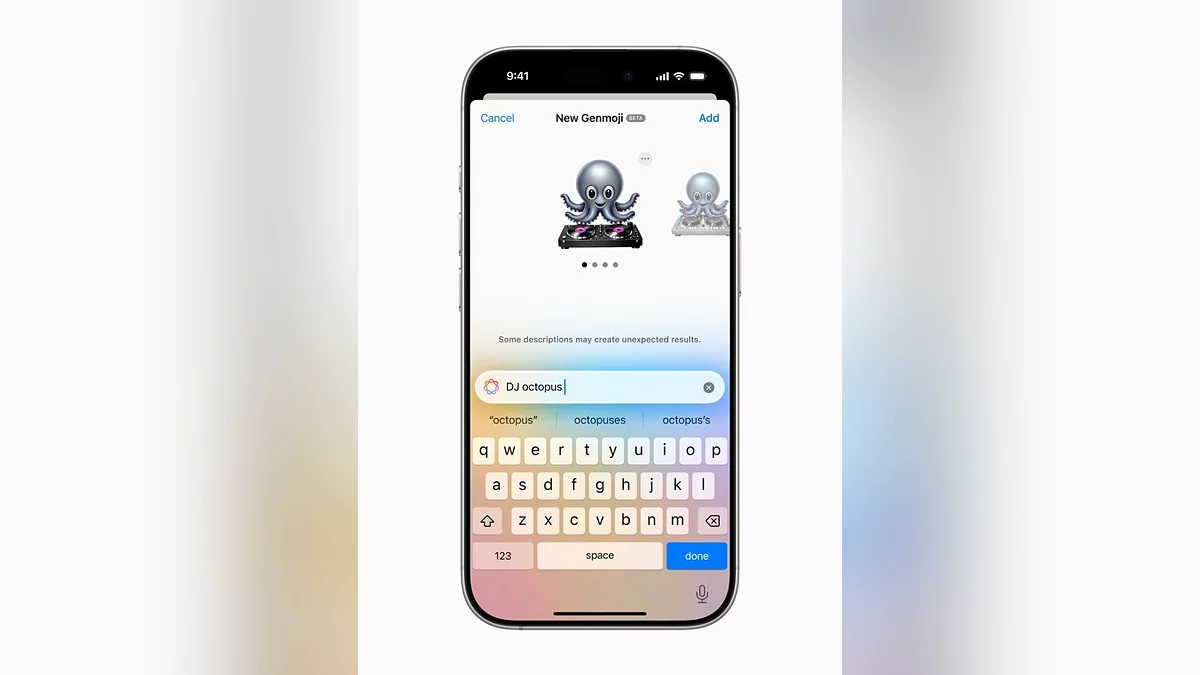 - Genmoji — создаёт уникальные эмодзи. Для этого достаточно открыть вкладку с эмодзи и описать желаемый предмет.