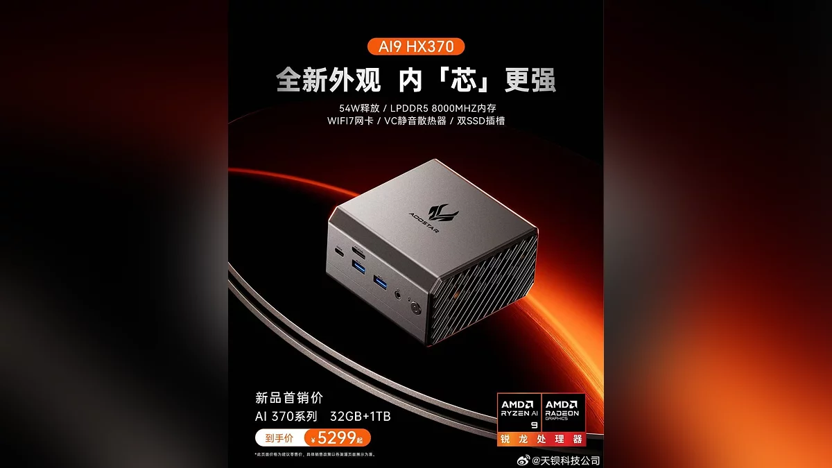 Компания Aoostar анонсировала новый мини-ПК на базе процессора AMD Ryzen AI 9 HX 370, разработанного на архитектуре Strix Point. Устройство позиционируется как мощное и универсальное решение с поддержкой передовых технологий, таких как Wi-Fi 7 и интерфейс OCuLink для подключения внешних видеокарт.