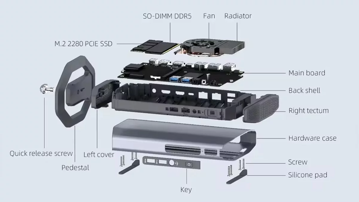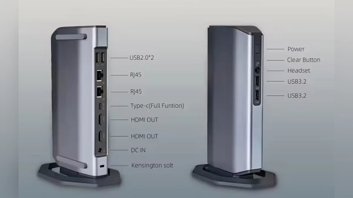 Устройство поддерживает подключение до трёх 4K-мониторов, а для подключения периферии имеются порты 2×HDMI, 1×USB Type-C, 2×USB 3.2 Type-A, 2×USB 2.0 Type-A, 2×Ethernet (2,5 Гбит), аудиоразъём 3,5 мм и разъём для блока питания DC. За беспроводную связь отвечают модули Wi-Fi 6 и Bluetooth 5.2.