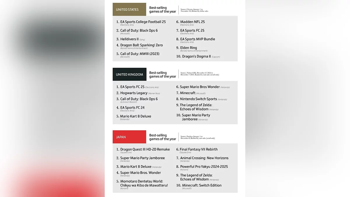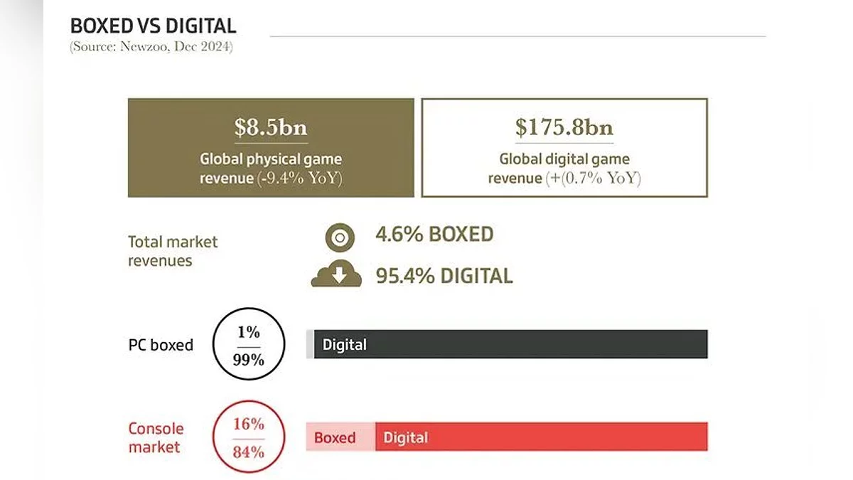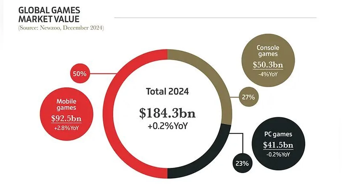 GamesIndustry.biz опубликовало традиционную аналитику, подводя итоги 2024 года в игровой индустрии. Согласно данным Newzoo, глобальная стоимость рынка видеоигр достигла рекордных 184,3 млрд долларов, с доминирующей долей мобильных игр — 92,5 млрд долларов. Консольный сегмент занял второе место с показателем 50,3 млрд долларов, а игры для ПК замыкают тройку с 41,5 млрд долларов.