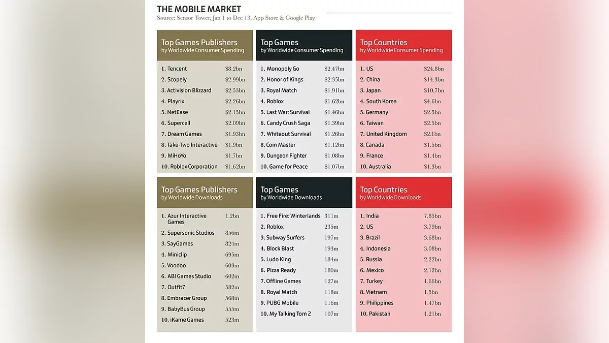 2024 год подтвердил продолжающийся рост мобильного сегмента, который укрепляет позиции как основной источник дохода. Консольные и ПК-игры, несмотря на отставание в объемах, сохраняют свою аудиторию благодаря громким релизам.