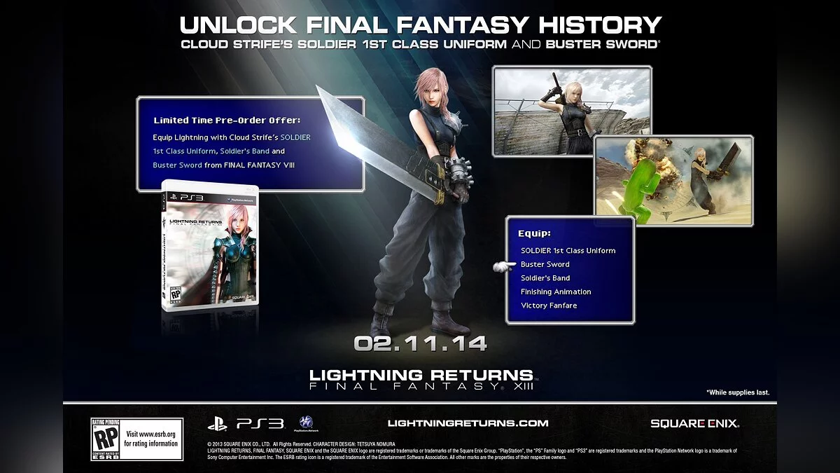 Для поклонников Final Fantasy не секрет, что седьмая часть серии считается одной из самых успешных, и сделанные на её основе ответвления, а также аниме «Последняя фантазия VII: Дети пришествия» прямое тому доказательство. Square Enix решила порадовать фанатов франчайза и объявила, что за предзаказ Lightning Returns: Final Fantasy XIII игроки получат костюм и легендарный мега-меч Клауда из Final Fantasy VII.