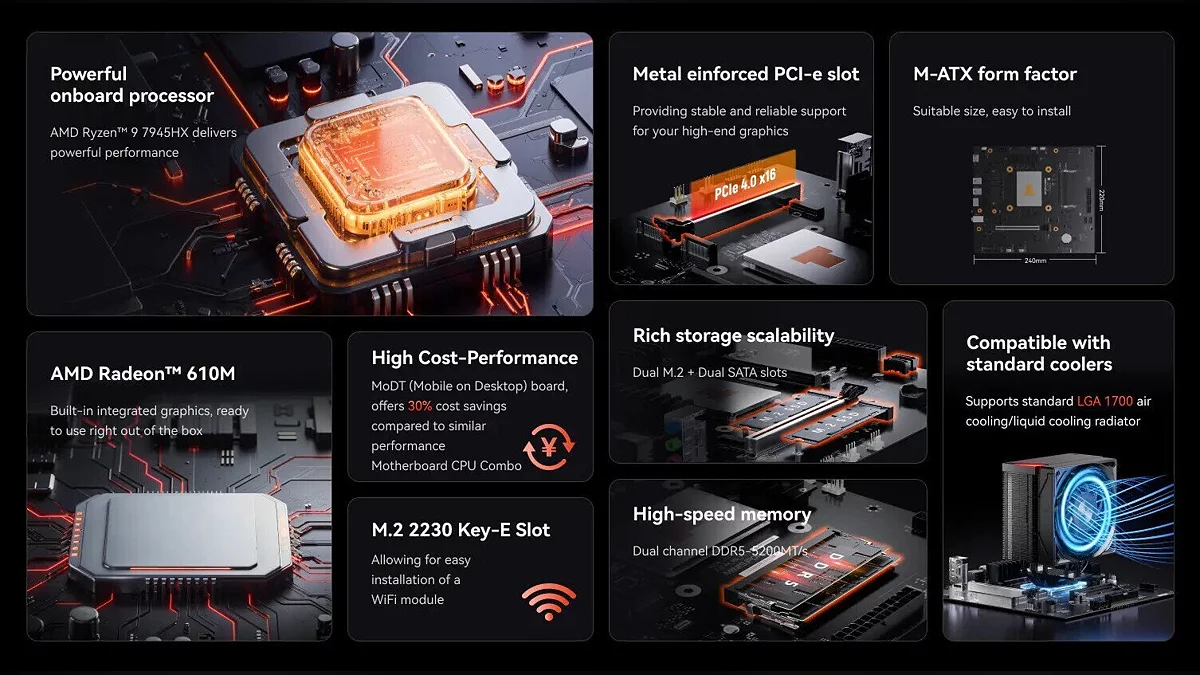 Материнская плата поддерживает до 96 Гб оперативной памяти DDR5-5200 (SO-DIMM) и два накопителя M.2 2280 (PCIe 4.0). Для дополнительного охлаждения можно установить 120-мм вентилятор с помощью стандартных креплений. Новинка уже доступна для покупки в Китае по цене $356 (около 35 000 рублей).